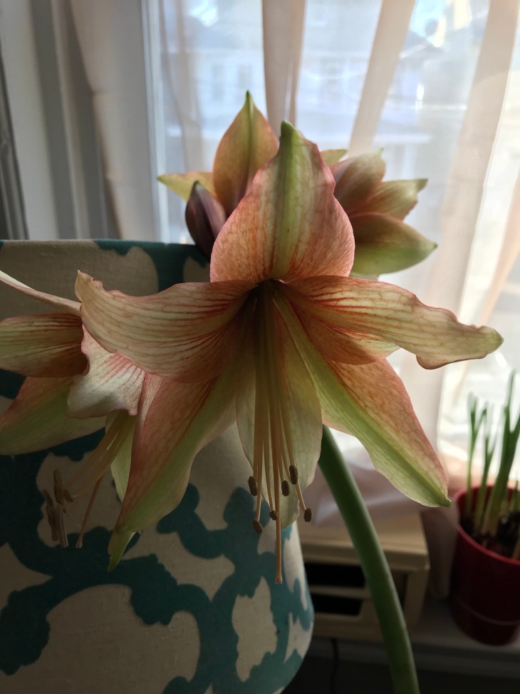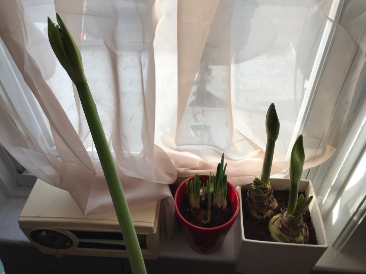 Not much of a jungle, actually, but rather pretty. Since Christmas has come and gone, Christmas planting gifts are, like, 75% off. I’ve got some amaryllis going, and in the center are the beginnings of paper whites. Save these little plants from shriveling up by buying them up for peanuts and letting them have light and water. Will post pics when they are grown up and beautiful. By the way, paper whites will make your house smell the way heaven smells. Just gorgeous.